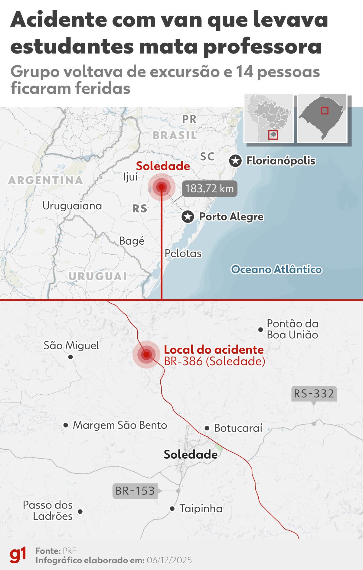 Acidente com van de estudantes que retornavam de excursão deixa um morto e 14 feridos no RS